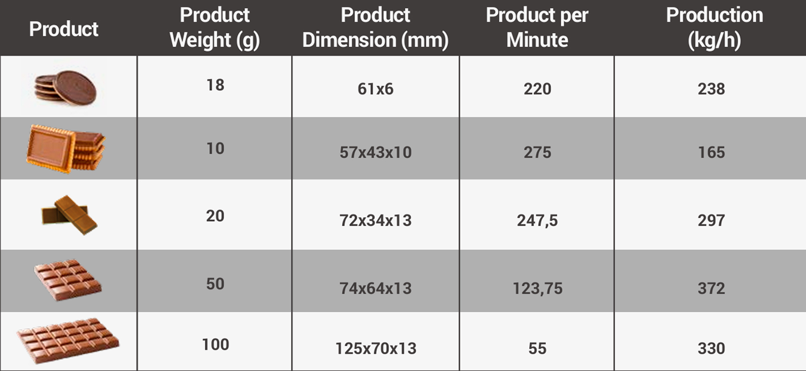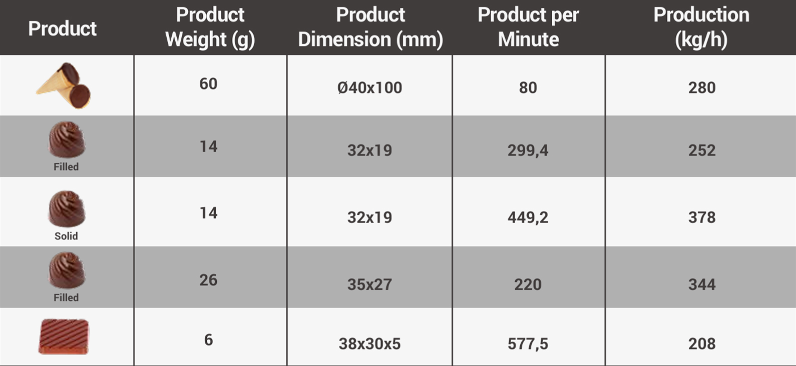 Composed of a Doser, Vibrating System, Cooling Tunnel, Automatic Unmolding System and Mold Reheating System. The equipment allows the automatic production up to 15 product molds per minute, without the use of labor. With a flexible design and fast setup, we guarantee a wide variety of products, meeting the highest quality standards. Below we can see some of the products and production capacity with the standard molds 275 x 175 mm or 300 x 300 mm, used in the production of molded chocolates with biscuits.